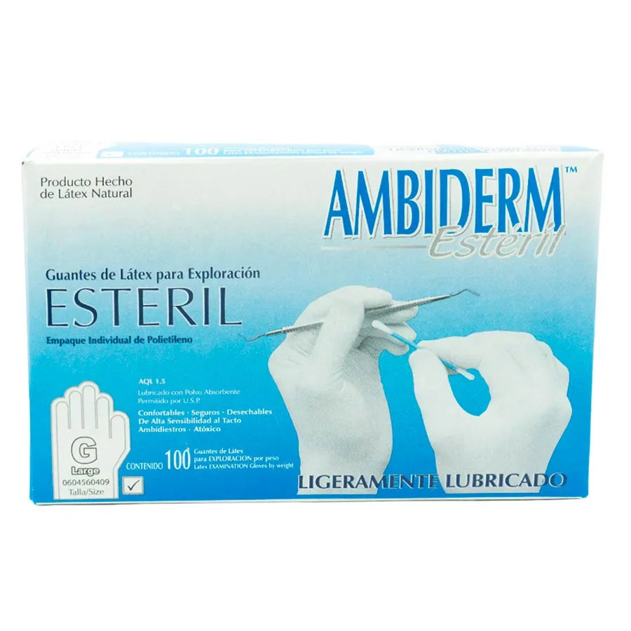 Guante de látex estéril en talla grande con textura sedosa y bajo contenido en polvo. Es resistente a productos químicos, alcoholes, ácidos y álcalis.
