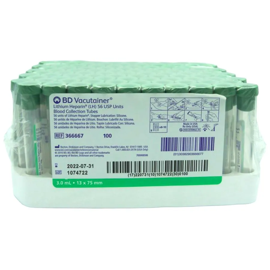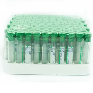Heparina de litio 3.0 ml 13 x 75 mm, tubo de plástico con Heparina tienen heparina de sodio o de litio aplicada por aspersión. Se utilizan para determinaciones de química clínica en plasma (urgencias), hematología (fragalidad osmótica)
